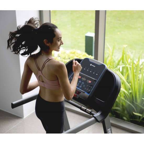 | Mostrar | 3 ventanas LED | | Entrenamiento / Comentarios en pantalla | Distancia, calorías, tiempo, velocidad, frecuencia cardíaca | | Programas / Entrenamientos | 35 programas, incluyendo manual, distancia x 13 niveles (1.6K, 3.2K, 5k, 8k, 10k, 12.8K, 15k, 16K, 20k, media maratón, 24K, 32K y metas de maratón), tiempo, calorías, quema de grasa x 10 niveles, Hill Climb x 10 niveles | | Ritmo cardiaco | Puños de contacto y Bluetooth HR Dimensiones (L x W x H): 162,5 x 77 x 139,5 cm Dimensiones plegables ( Largo × ancho × alto):94,6 x 77 x 143 cm Usuario Capacidad de peso: 113 kg